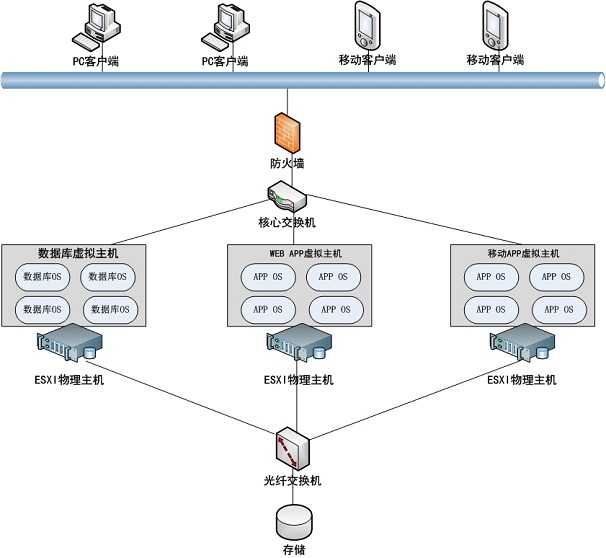 各类小而多,但在高峰时刻的访问量很大,对数据在高峰时刻的可用性及性能要求严格。基本此业务特点,云创数据系统架构师精心思考设计了虚拟化解决方案。此方案使客户在硬件投入上的成本大大降低,同时充分利用硬件资源和虚拟化软件极大的保证了客户端的并发访问量与数据的可用性。此次方案简要架构图如下: